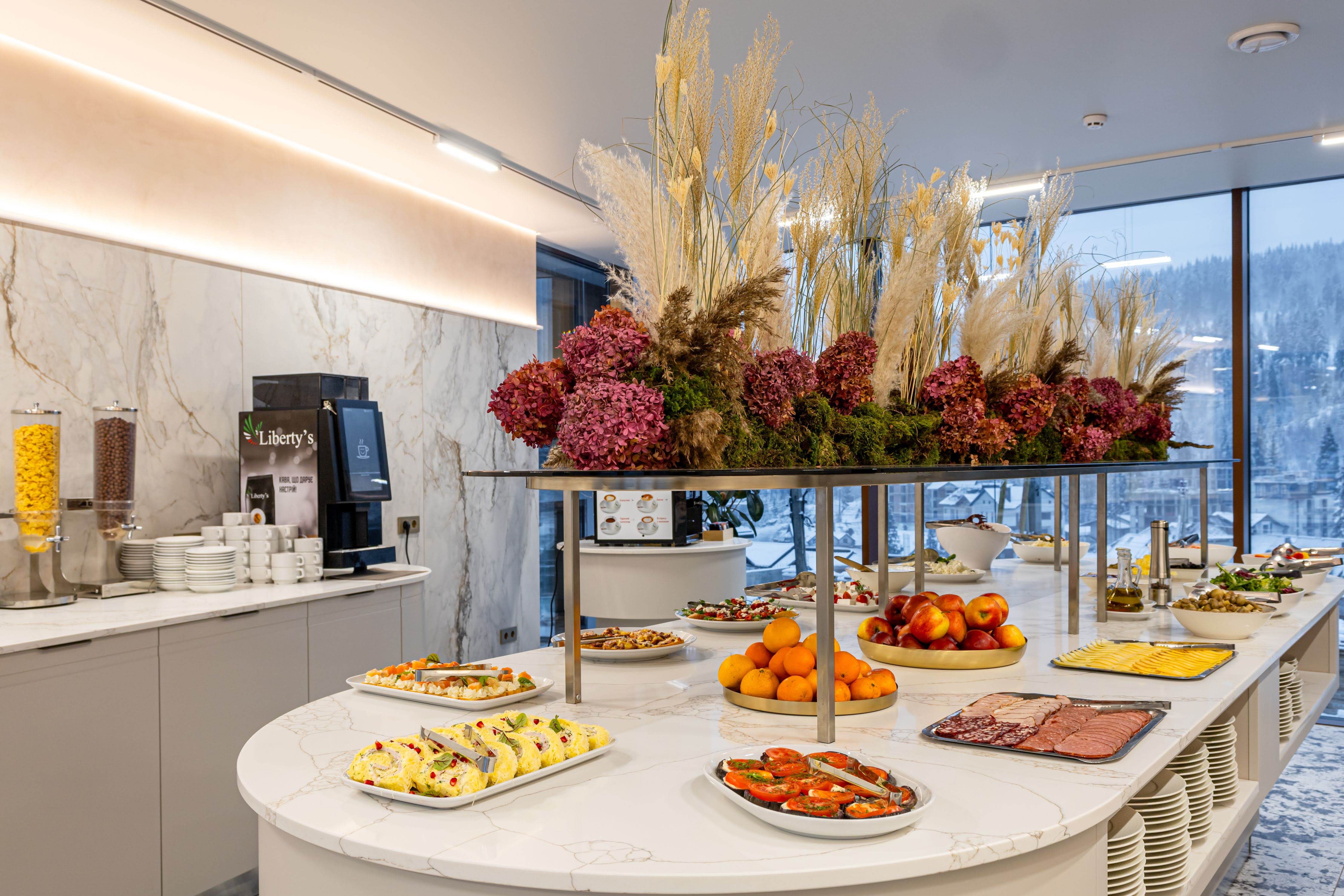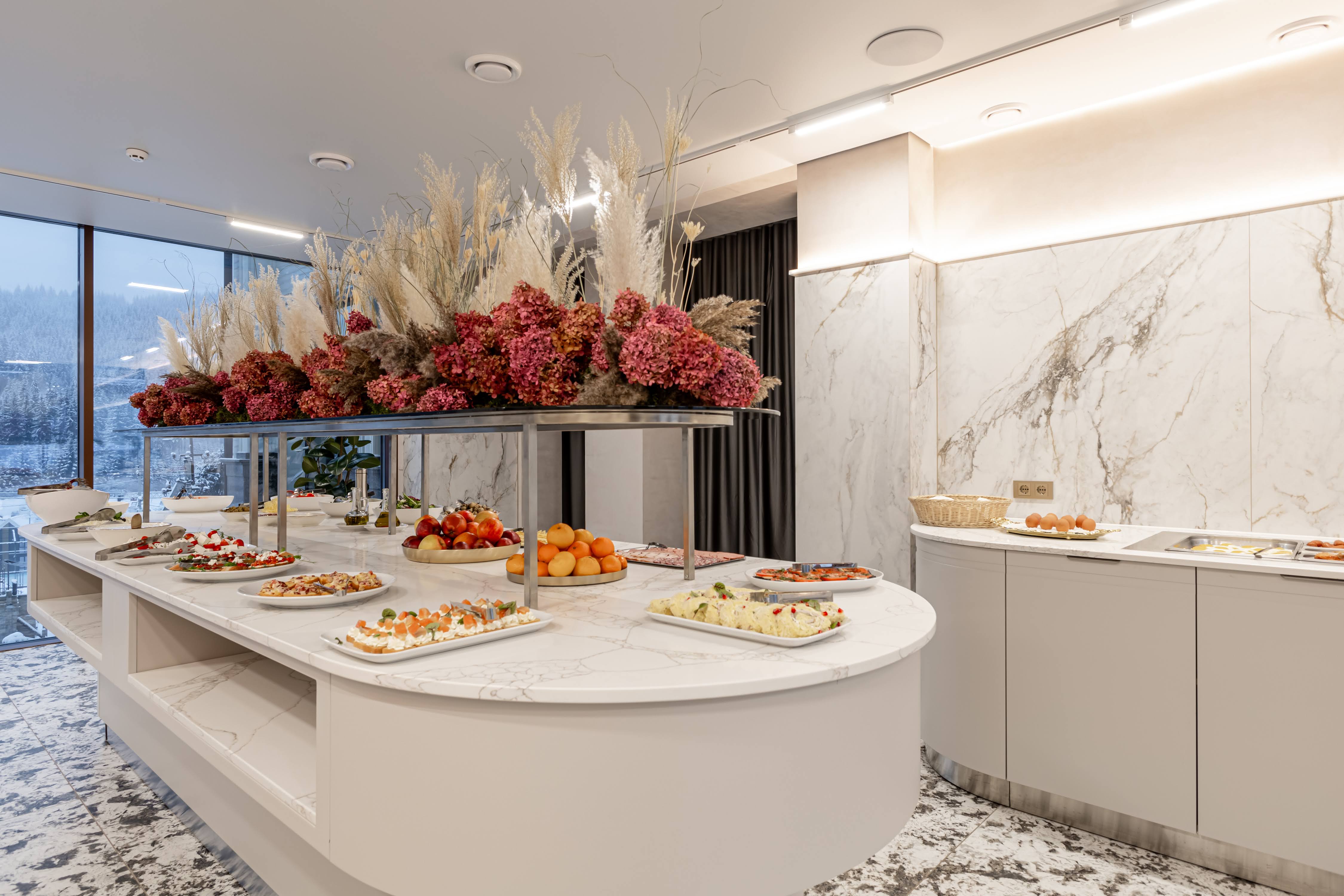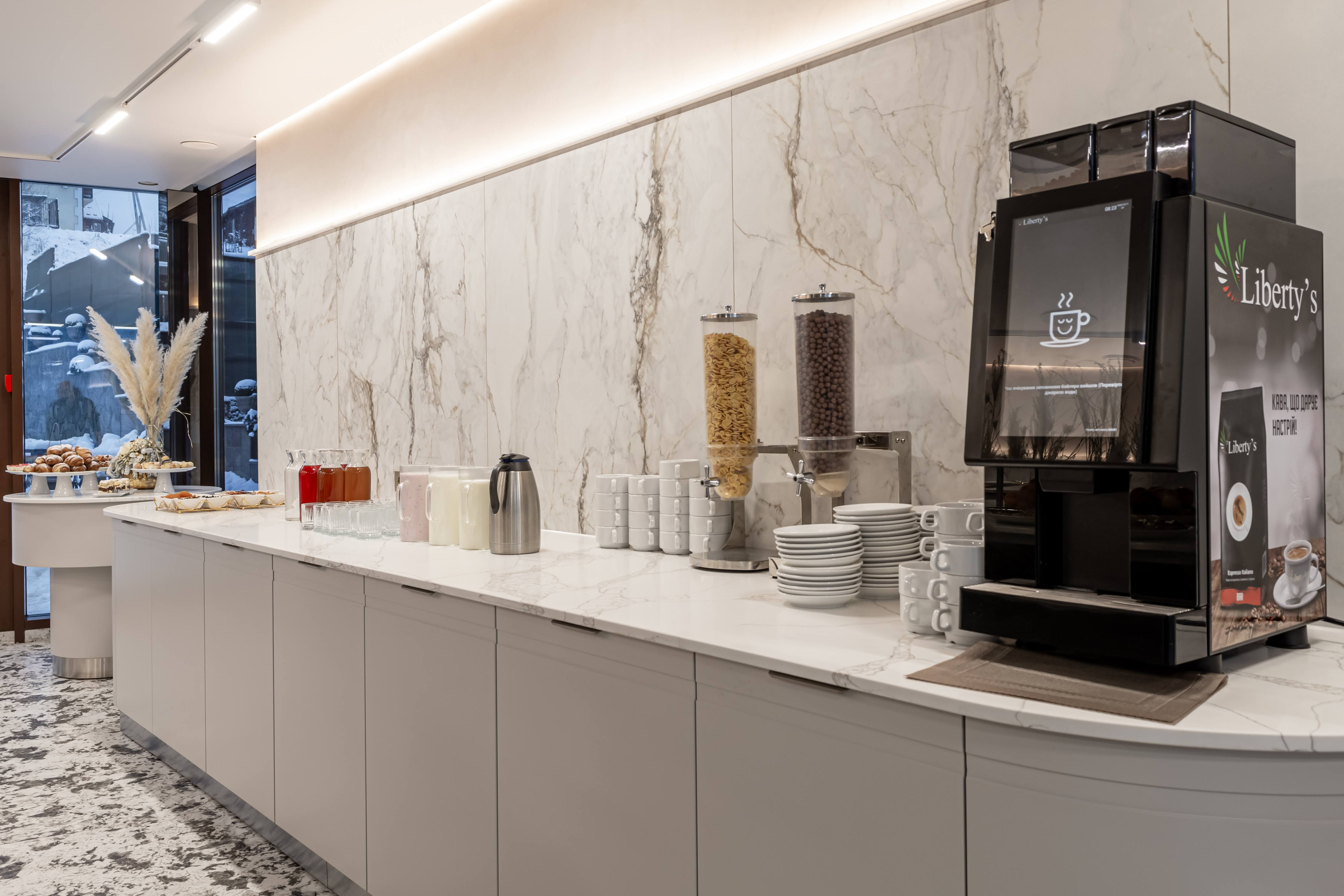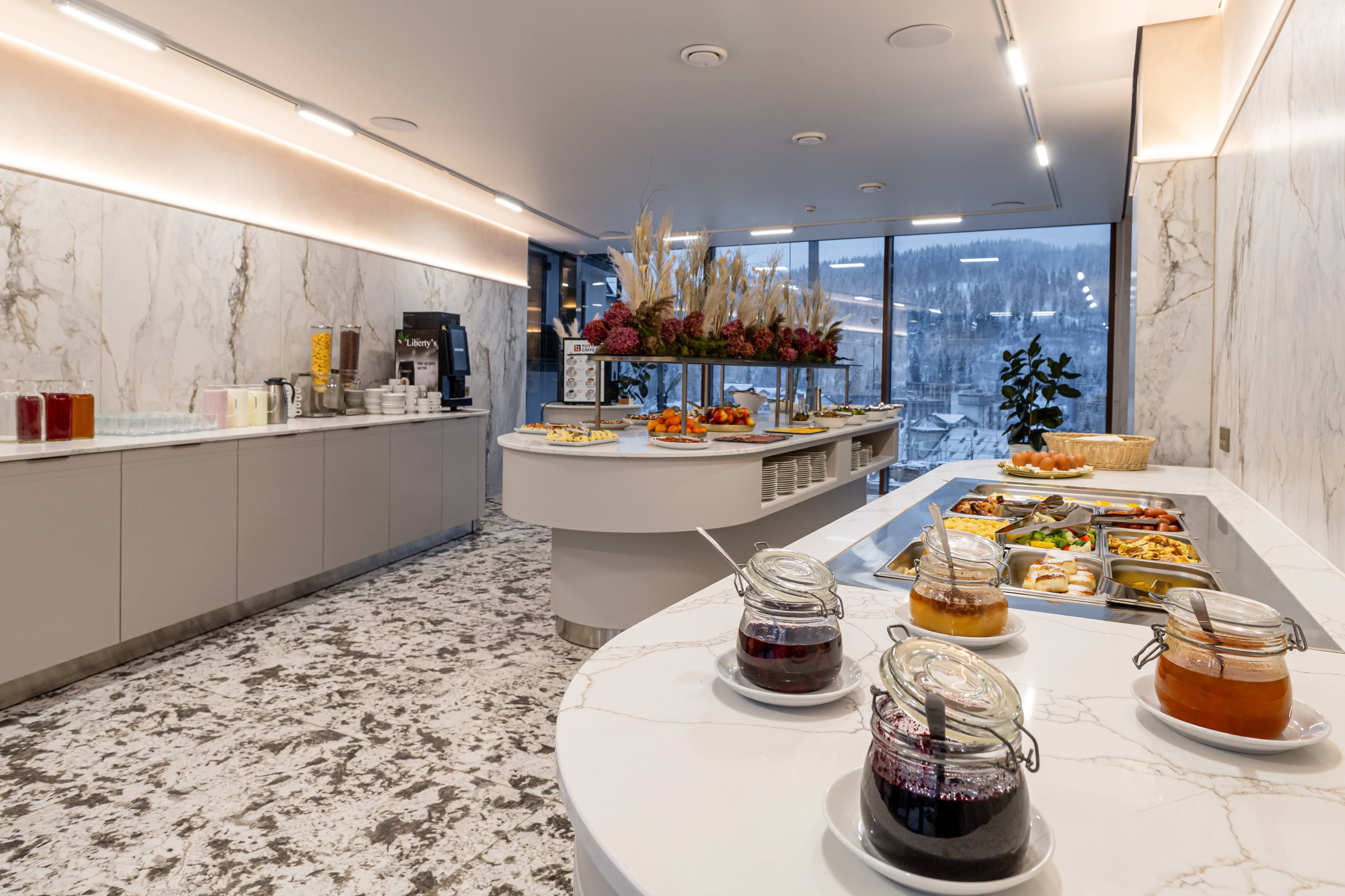 До Ваших послуг європейський сніданок типу «шведський стіл» із різноманіттям холодних закусок, свіжої випічки і багато іншого. Гостям пропонується гаряча страва на вибір. Влітку гості мають можливість поснідати на відкритій терасі з чарівним видом на гори.