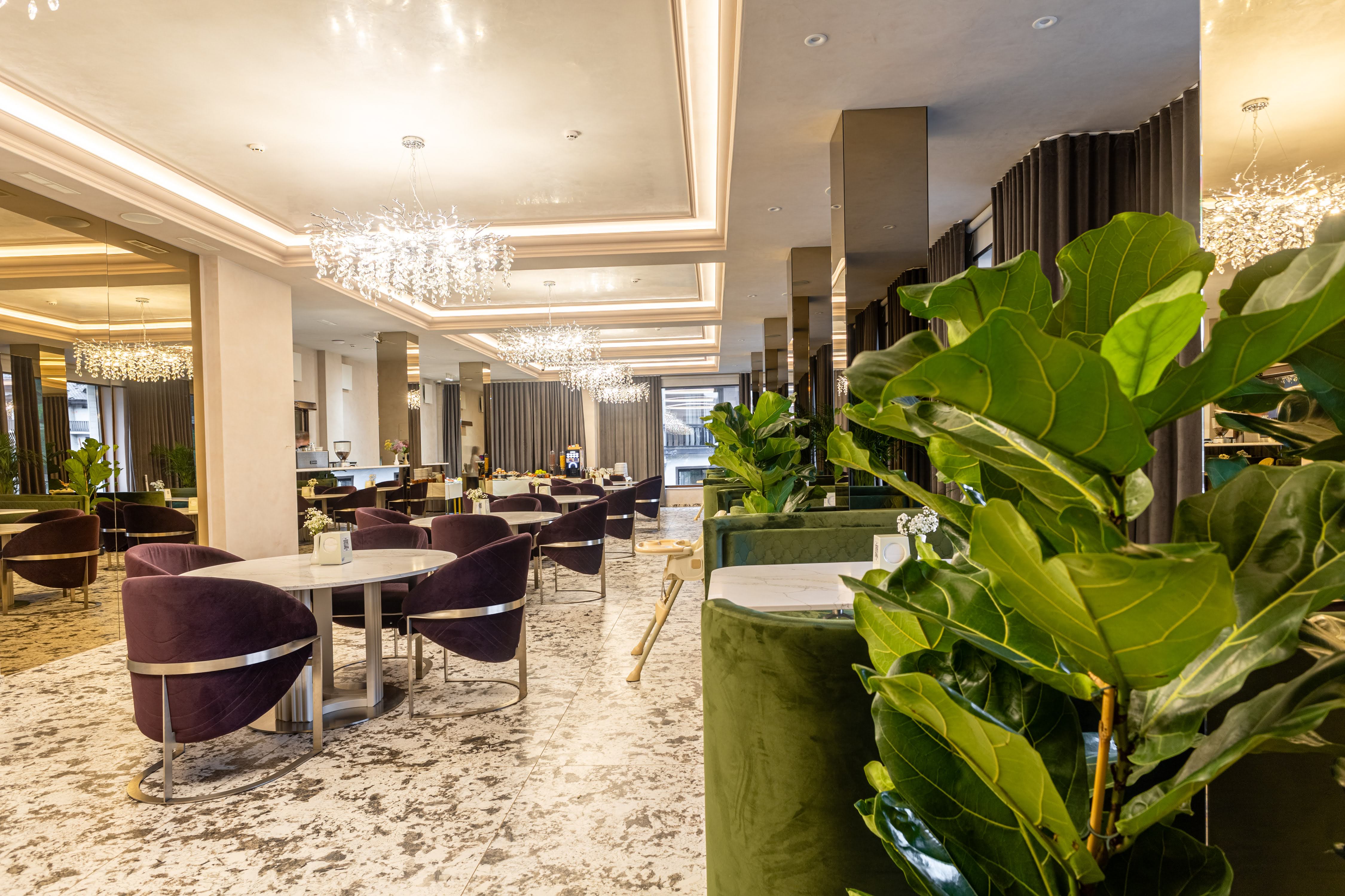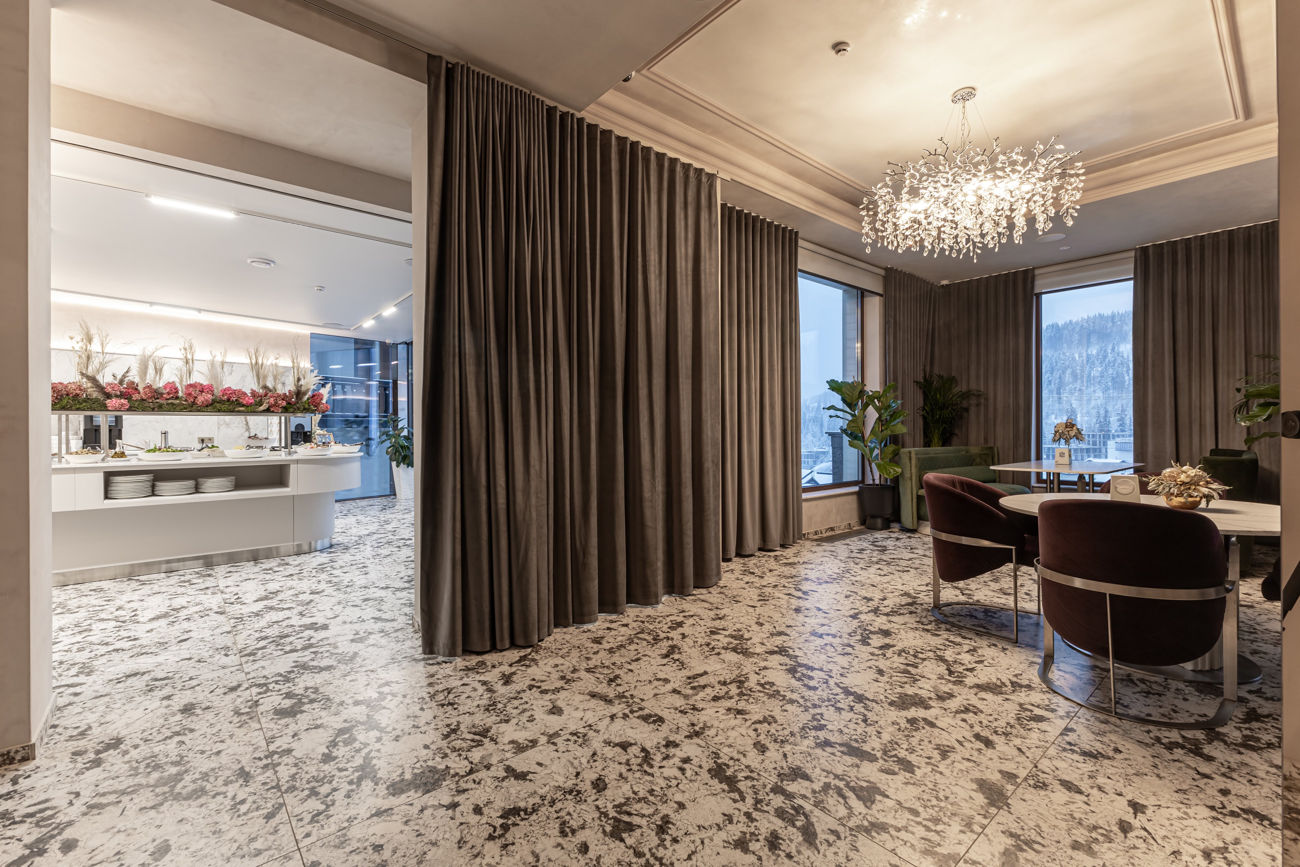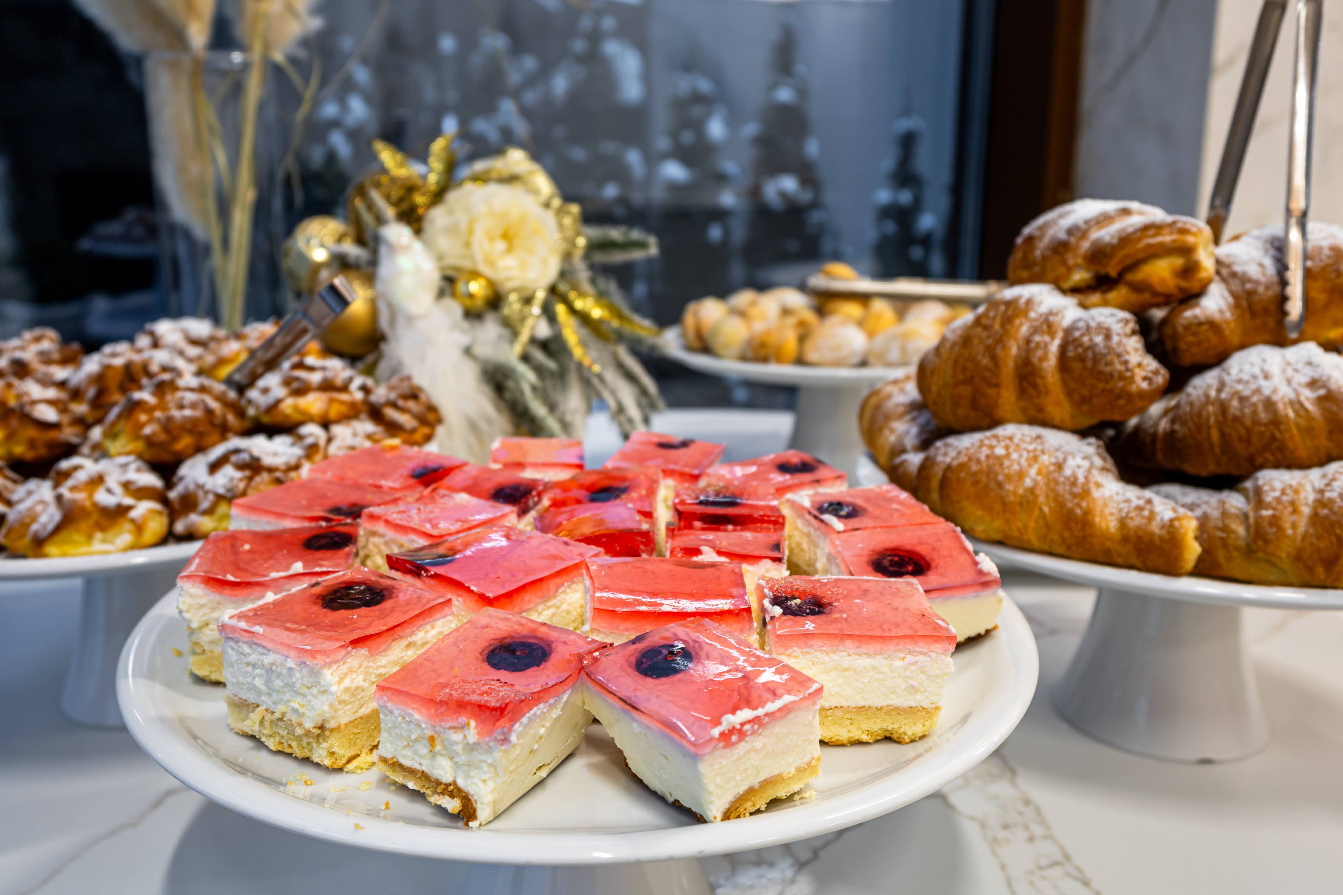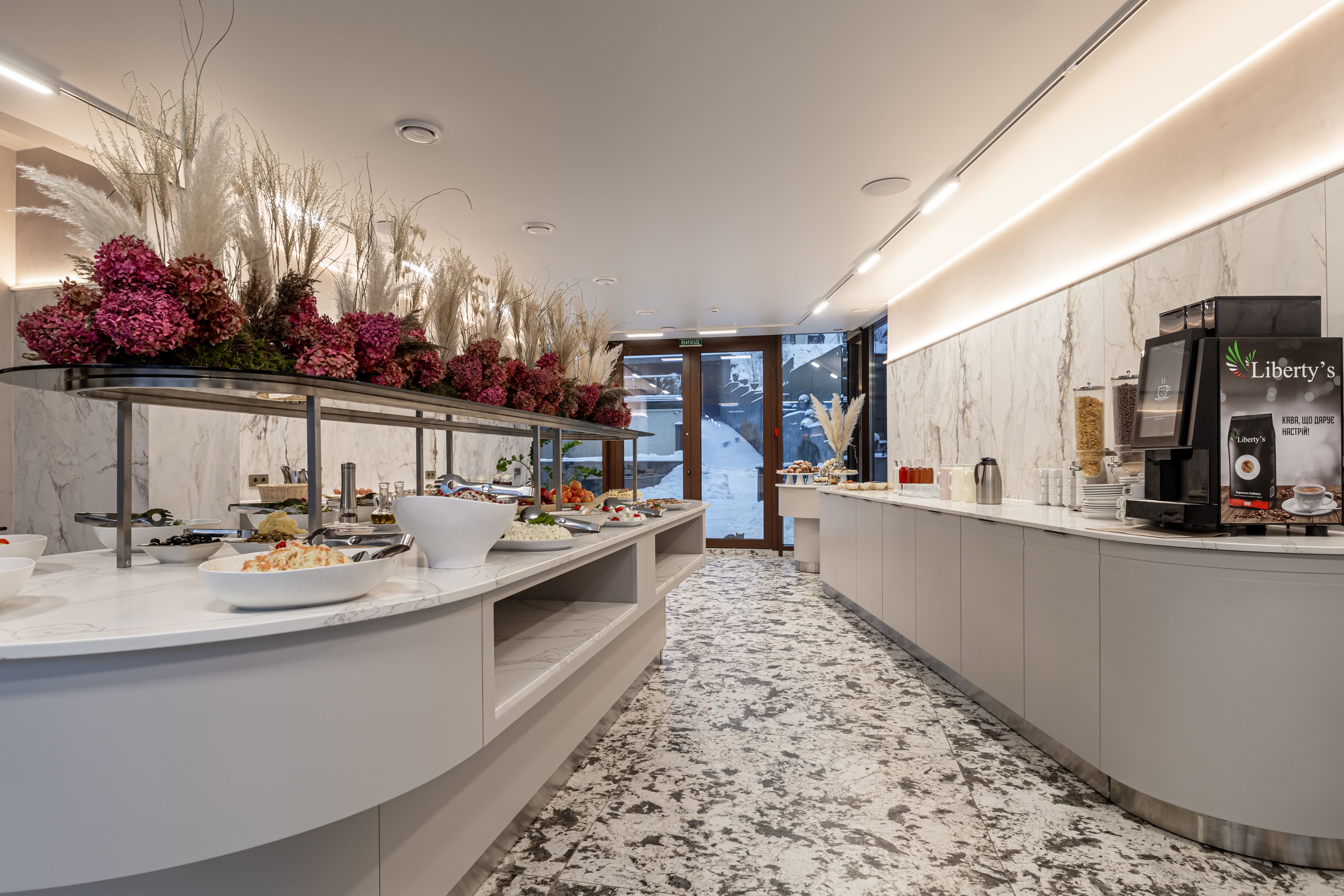 До Ваших послуг європейський сніданок типу «шведський стіл» із різноманіттям холодних закусок, свіжої випічки і багато іншого. Гостям пропонується гаряча страва на вибір. Влітку гості мають можливість поснідати на відкритій терасі з чарівним видом на гори.